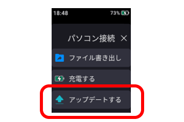 - (SR302 Proでの操作)USBケーブル接続後、SR302 Proデバイス上に以下の画面が表示されるので、「アップデートする」を選択する
